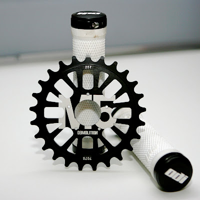 Demolition M5 25T sprocket and ODI Ruffian grips in white.